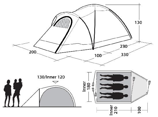 Šator za tri osobe s povećanim prednjim predvorjem brzo se i jednostavno postavlja. Vanjski materijal je vatrootporni Outex® 3000 Select poliester, koji je 100% poliester. Unutarnji materijal je tanki i prozračni poliester. Pod je izrađen od polietilena s dvostrukim PU premazom.