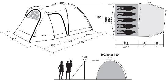 Šator za pet osoba s tri ulaza i podignutim i produženim prednjim predvorjem brzo se i jednostavno postavlja. Vanjski materijal je Outex® 3000 Select vatrootporni poliester, koji je 100% poliester. Unutarnji materijal je tanki i prozračni poliester. Podloga je izrađena od polietilena s dvostrukim PU premazom.